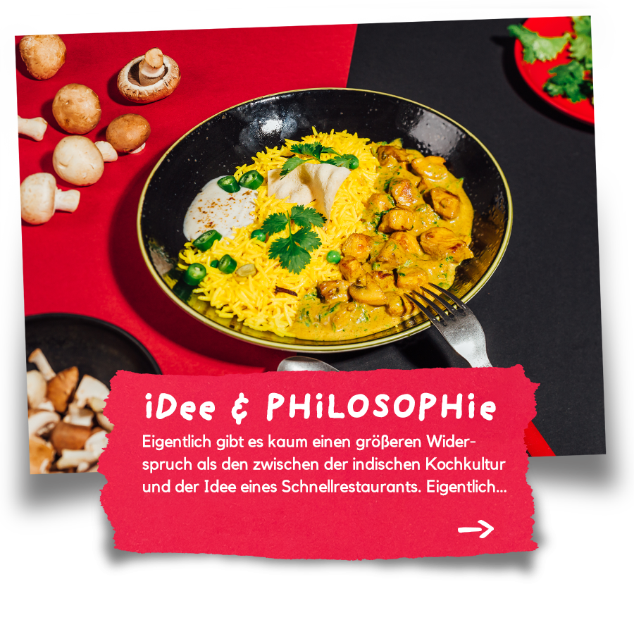 In unseren Filialen kannst du dich überzeugen, wie die Fusion aus bester indischer Kochtradition und moderner, schneller Küche gelingt. Während die Currys in unserer Hamburger Home Base sorgfältig und schonend gekocht werden, bereiten wir Gemüse und Fleisch der Menüs frisch und direkt vor deinen Augen zu. Ob vegan, vegetarisch oder Fleischvariante – die Vielfalt unserer indischen Gerichte bietet für jeden den passenden Gaumenzauber!